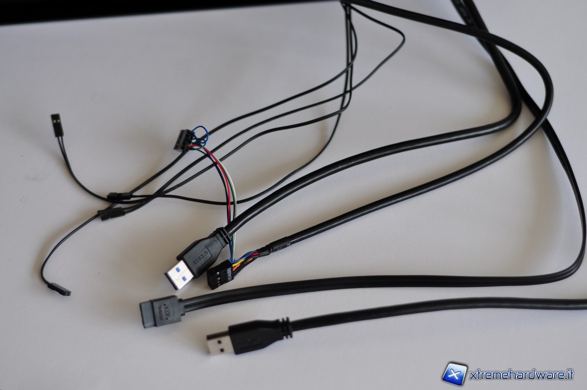 Sulla parte superiore sono presenti i pulsanti di accensione e di reset. A fianco si trovano due porte USB 3.0, due fori per le connessioni audio un jack per HD + AC97 e uno per il microfono; infine è presente anche una porta eSATA. I cavi per connettere queste porte e pulsanti sono molto lunghi, forse sarebbe il caso di dire fin troppo lunghi.