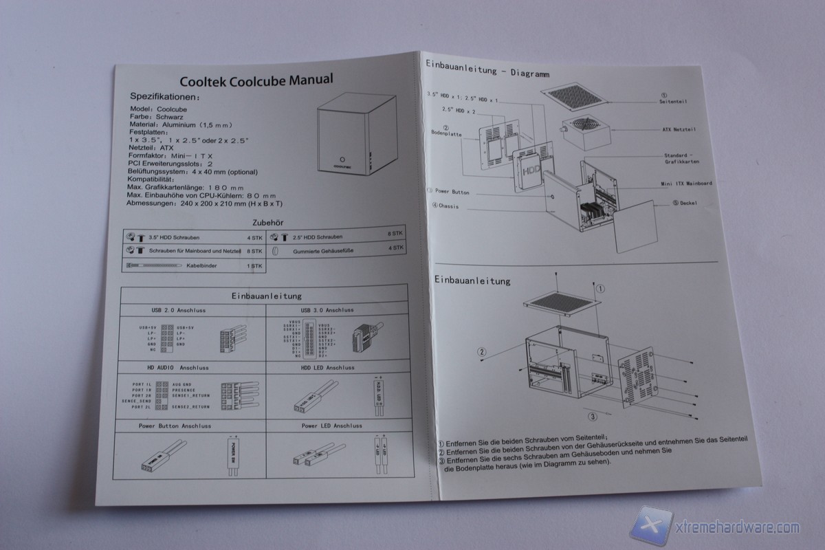 Passiamo ora ad aprire la confezione. Come notiamo appena aperta la confezione troviamo subito il manuale su un unico foglio il quale ci indica come smontare il case ed il bundle in esso contenuto. Il case è protetto da delle forme in gomma bianca che lo proteggono al loro interno e in più è presente la classica busta trasparente contro la polvere, ulteriori danni o lesioni che potrebbero presentarsi sulla struttura del case. Il bundle è essenziale, ma sufficiente per l'installazione e l'assemblaggio dei componenti all'interno del case.