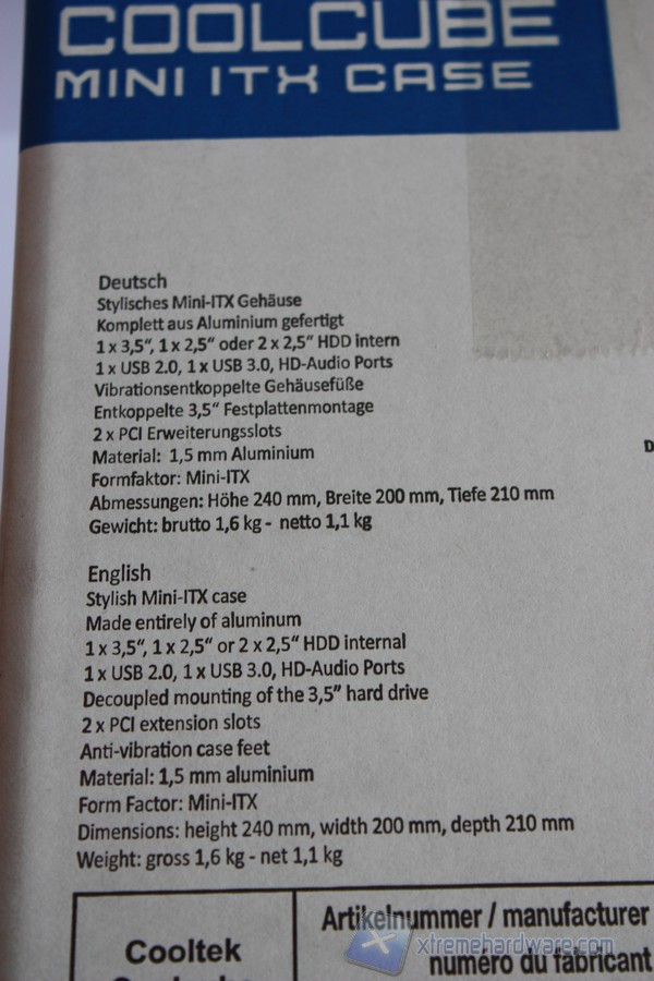 Andiamo ora ad analizzare nel dettaglio la confezione del Coolcube. Come possiamo notare la confezione riprende la forma cubica del case in esso contenuto. Nella parte frontale, ma anche su gli altri lati della stessa sono sempre presenti il logo del brand Cooltek e il modello con la tipologia del case. Nella parte frontale troviamo un disegno del case con a lato le caratteristiche principali nonchè la scritta "Full Alluminium" che non lascia dubbi sul materiale strutturale del case. Nella parte posteriore della confezione invece troviamo un altro disegno con l'"esplosione" dei vari pannelli con relative caratteristiche tecniche e spiegazioni. Notiamo inoltre come il comparto storage, quindi i dischi che verranno montati, è posto nella parte bassa e quindi alla base del cubo, rendendo cosi più facile l'espulsione di calore anche grazie alle feritoie presenti. Ambo i lati della confezione troviamo in tre lingue ovvero tedesco, polacco e francese, le caratteristiche tecniche del Coolcube che rendono sin da subito le dimensioni molto compatte e quindi ideali per qualsiasi collocazione. Vengono inoltre menzionati i codici prodotto,seriali e il colore, nonchè i loghi tra cui RoHs che ci indica che il case non è stato realizzato con metalli pesanti come il piombo o altri che possono essere dannosi per la salute dell'utente.